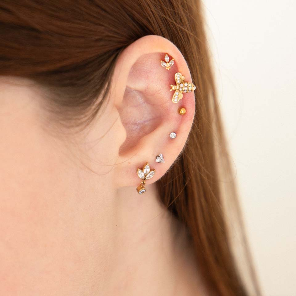 Este encantador labret contém três pedras com corte marquesa embutidas numa flor de lótus e ainda uma pedra redonda embutida num pendente.
