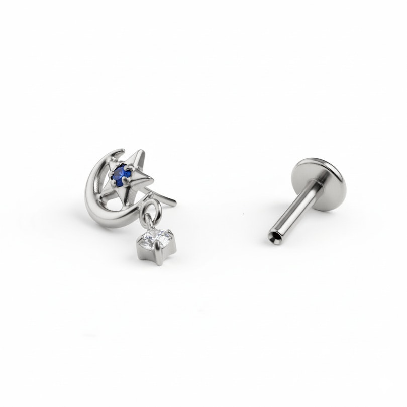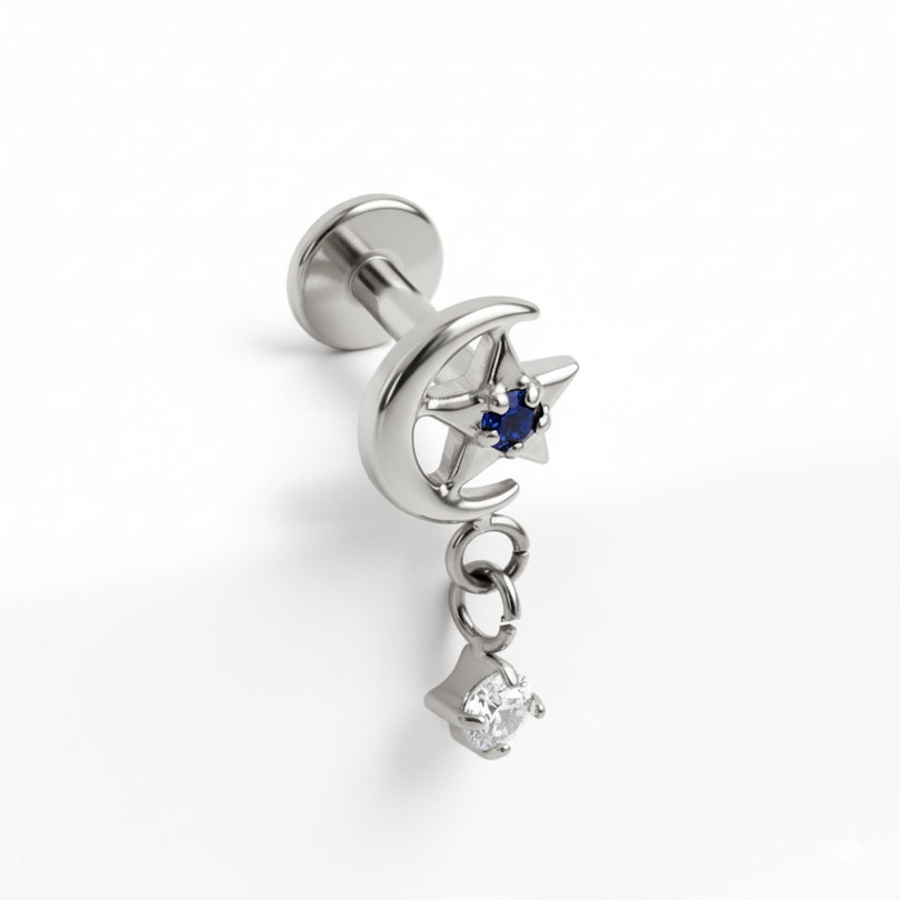 Este labret em titânio com lua e estrela e pendente adiciona movimento ao teu look. À frente contém uma pequena lua e uma estrela, com um pendente minúsculo, que balança suavemente à medida que te mexes. É uma joia decorativa sem exageros e é ideal para quando precisas de algo mais expressivo. Disponível em dourado e prateado.