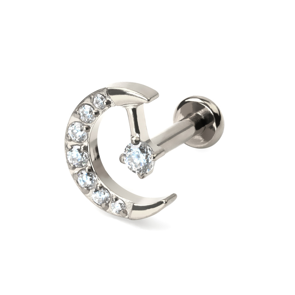 Este labret fofinho contém uma lua em quarto decrescente encrustado com pequenas zircónias e outra maior no topo da lua.