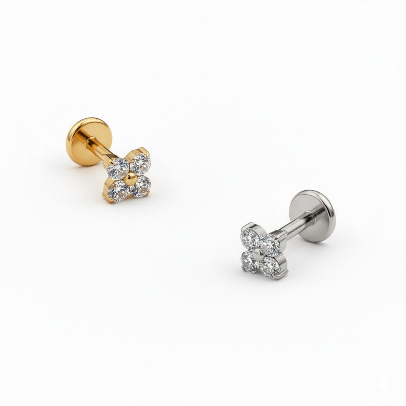 Este labret em titânio com mini flor dá ao teu visual um toque floral suave, graças às suas pequenas pedras dispostas em forma de flor. As pedras presas ao engaste de garras assentam junto à pele, criando mais detalhes na joia sem exagerar. Esta joia está disponível em dourado e prateado e em dois tamanhos. A opção mais pequena é muito subtil, mas a maior já tem mais presença. Se usados em conjunto, os dois tamanhos criam um look em camadas simples que dá a sensação de estrutura.