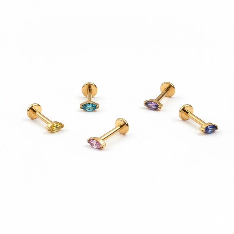 A pedra em corte marquesa torna o teu conjunto da orelha ainda mais refinado. A joia é feita de titânio ASTM F136, por isso, é hipoalergénica, resistente à água e pode durar uma vida. A rosca interna evita as irritações e mantém a joia segura, para que não te preocupes com a sua fuga.