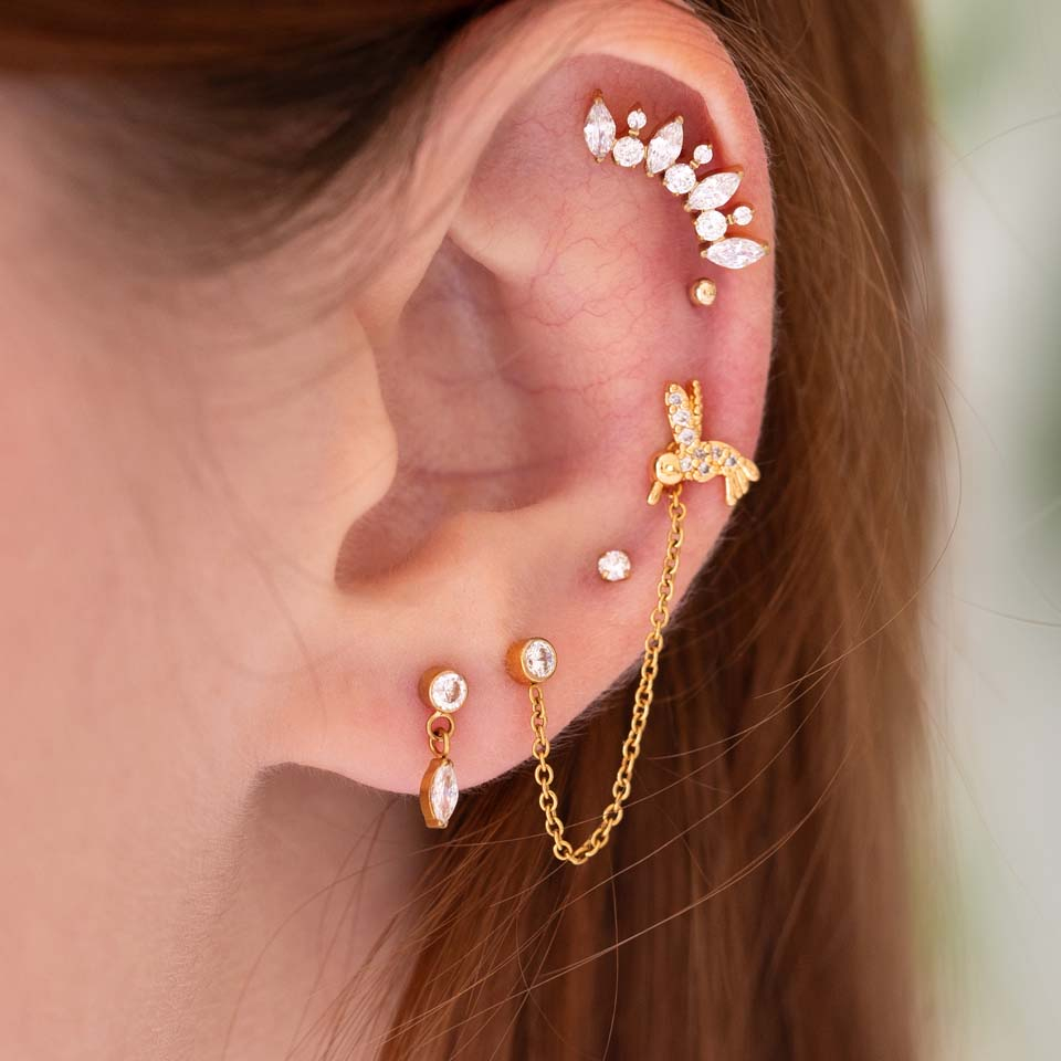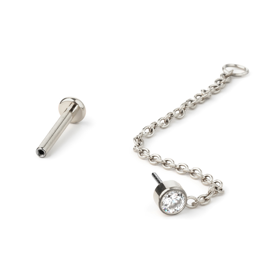 Este labret simples tem uma pedra embutida e uma corrente presa ao fundo da estrutura com uma pequena argola. A corrente tem uma argola maior na outra extremidade para poder ser colocada na traseira do labret - assim ficarás com uma corrente a passar por baixo da orelha - ou noutra joia da tua orelha.