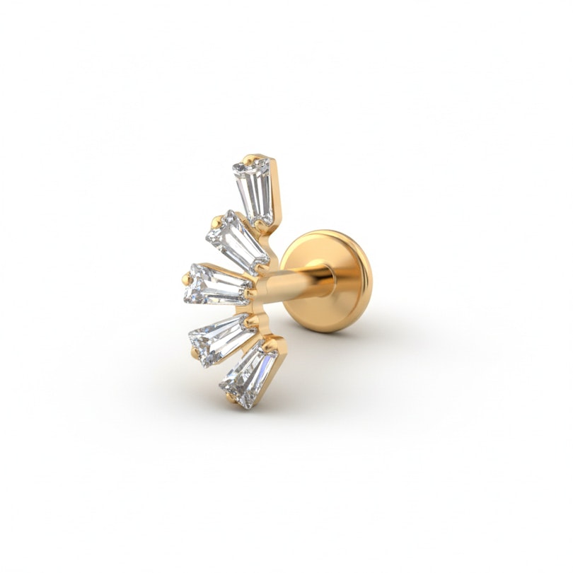 Este labret em titânio com pedras com corte baguette foi feito para utilizar em momentos estruturais. As pedras em corte baguette estão perfeitamente alinhadas, organizando-se de forma clara na tua orelha, para dar uma sensação de equilíbrio.