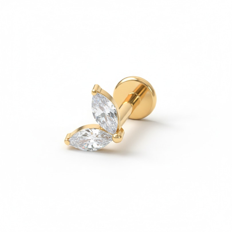 Este labret em titânio com pedras gémeas é uma verdadeira joia de ostentação subtil com pedras que refletem a luz para todo o lado. Não é brilho a mais e não é básica demais. É o equilíbrio perfeito numa joia que vai assentar naturalmente no teu piercing.