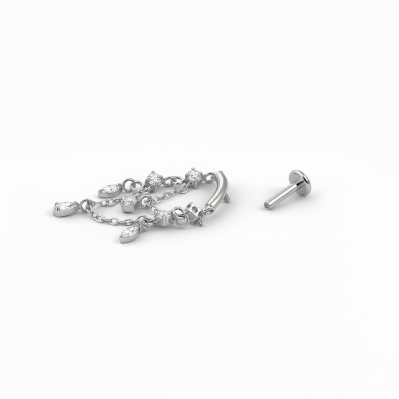 O labret em titânio com pendentes tipo candieiro é um grito ao movimento. Abaixo da joia, há pequenas gotas de pedra cravadas e suspensas, que se mexem suavemente quando viras a cabeça. É uma joia complexa sem exageros e resulta bem para quando precisas de algo diferente do habitual. Disponível em dourado e prateado.