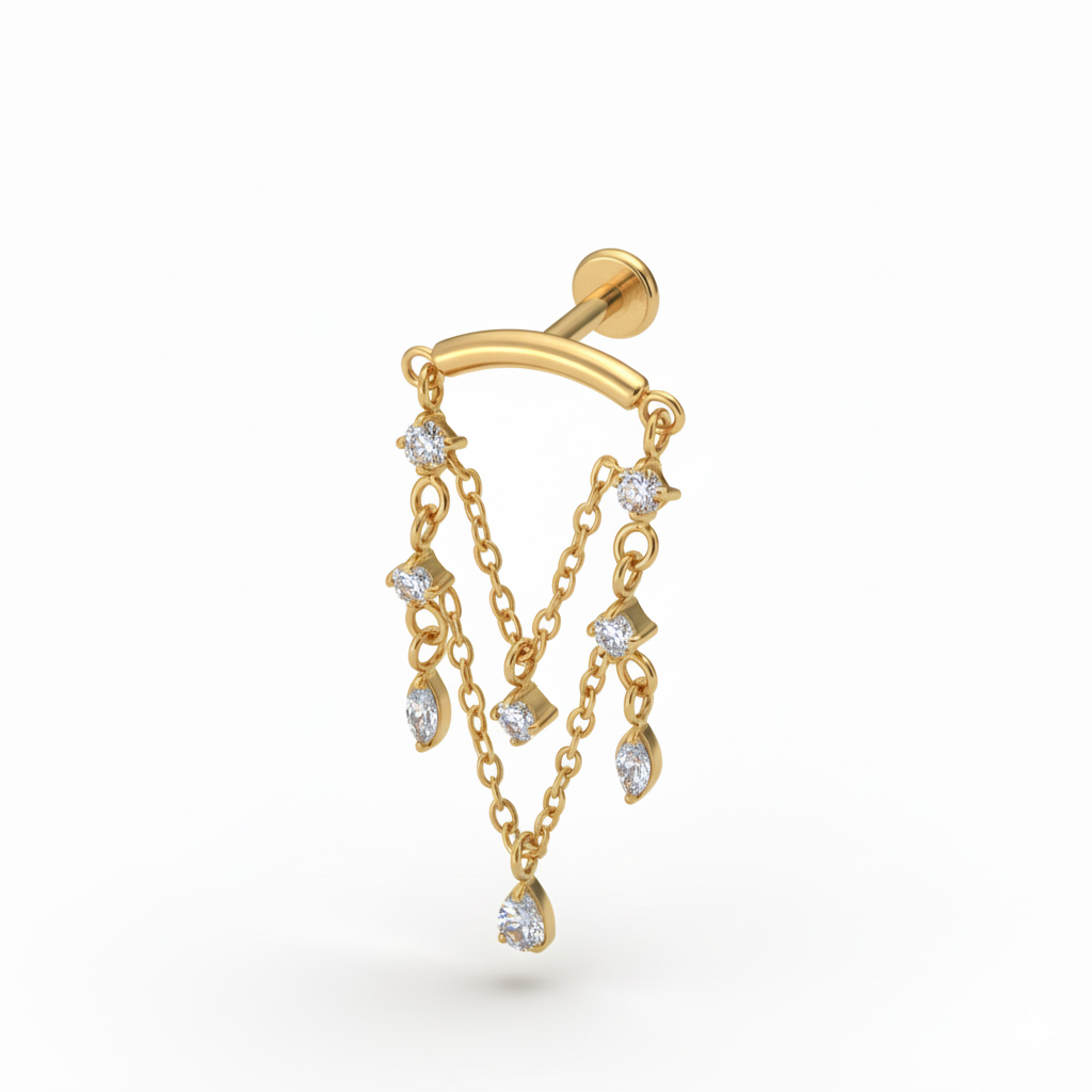 O labret em titânio com pendentes tipo candieiro é um grito ao movimento. Abaixo da joia, há pequenas gotas de pedra cravadas e suspensas, que se mexem suavemente quando viras a cabeça. É uma joia complexa sem exageros e resulta bem para quando precisas de algo diferente do habitual. Disponível em dourado e prateado.