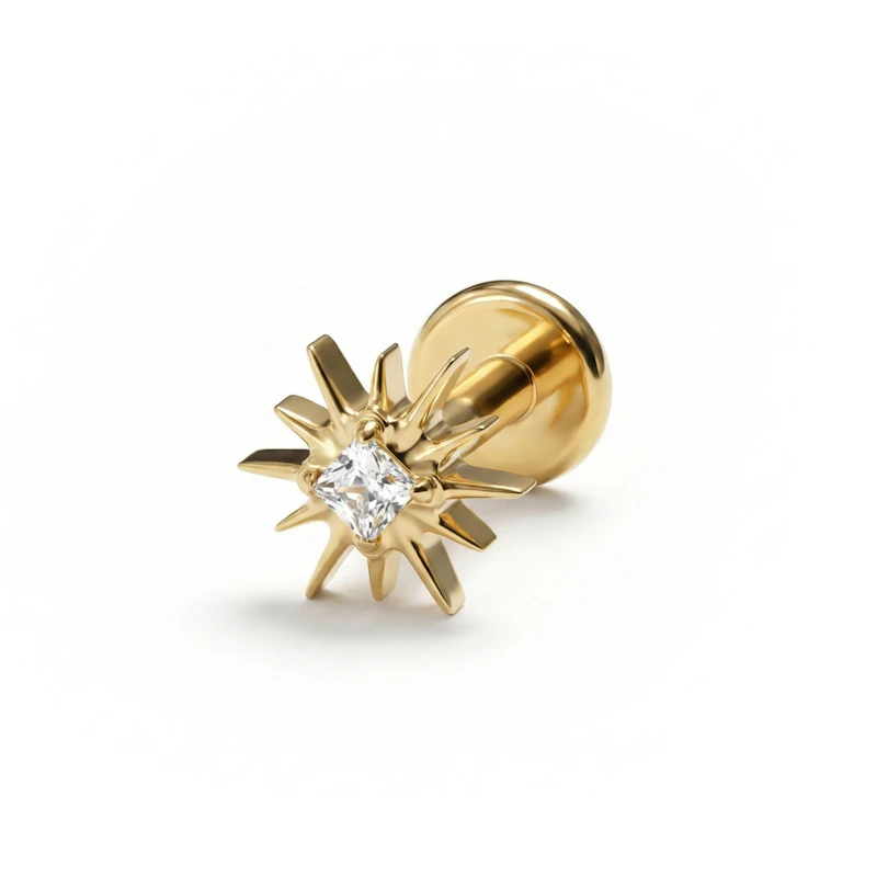 Dá um toque de brilho ao teu conjunto com este labret em titânio com raios de sol. O design leve, que capta a luz, dá uma dimensão subtil, mantendo mesmo assim o teu estilo simples e fácil de usar todos os dias.