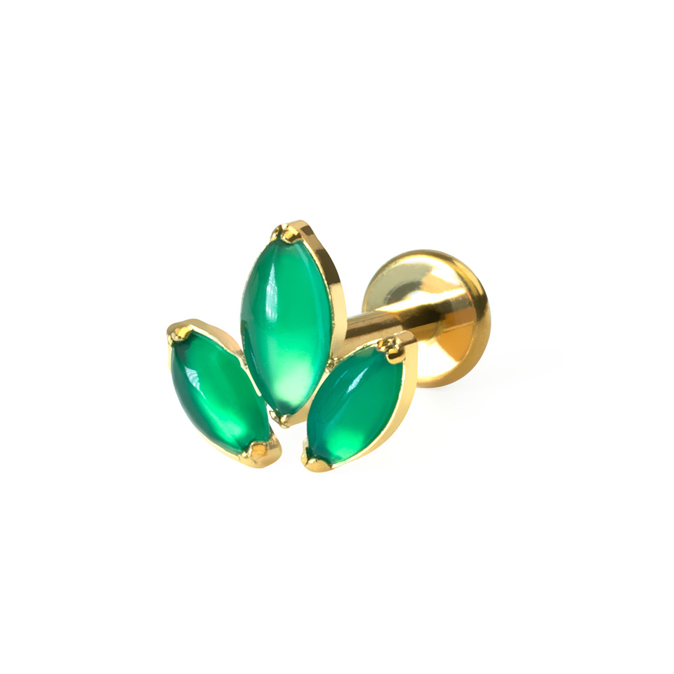 Este estiloso labret contém 3 pedras verdes em corte marquesa dispostas em forma de flor de lótus.