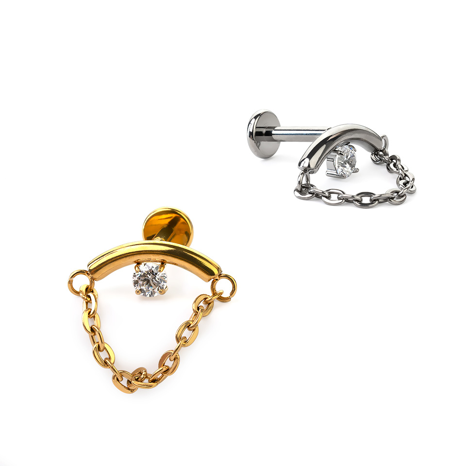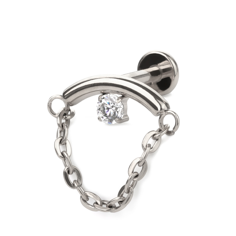 O design deste labret em titânio é composto por uma barra curva com uma corrente que junta ambas as extremidades e argolinhas em baixo. No centro da barra está uma zircónia cúbica embutida. Coloca este labret horizontalmente no teu lóbulo ou no teu helix, para que a curva acompanhe os contornos da tua orelha.
