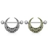 Esta jóia é para si que tem o mamilo perfurado. De preferência na horizontal, pois estas jóias são mais adequadas para esta direção. As jóias consistem em toda a sua simplicidade, numa barra longa de 22 mm feita de aço cirúrgico. Um escudo está fixado na barra usando dois anéis na parte de trás do escudo. O escudo tem a forma de uma lua crescente, aberta no topo. A lua crescente está decorada com pequenos padrões peculiares, chamados de filigrana. O escudo é feito de latão. Pode escolher a jóia em duas cores diferentes, o que também pode ser visto na figura acima. Há uma cor dourada e outra prateada. Ambos os modelos têm um fundo preto para destacar ainda mais o padrão do escudo - também confere às joias uma aparência antiga, pois parece uma forma de oxidação. O diâmetro interno da lua é 13 mm. Portanto, o seu mamilo não pode ser maior que isso; caso contrário, terá dificuldade a o escudo.