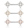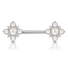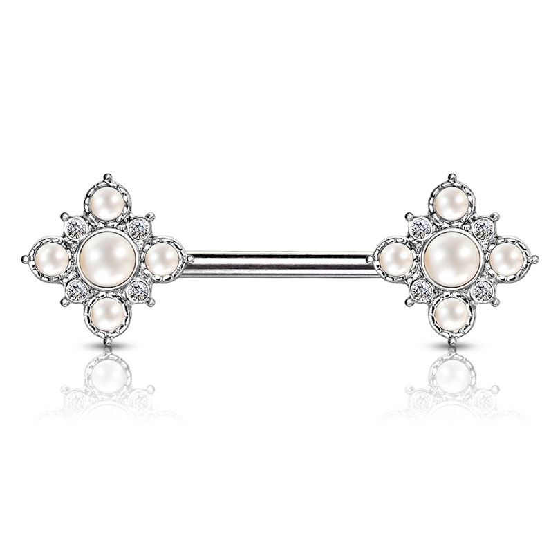 As jóias que vê acima são para si com um piercing num mamilo - ou um piercing em cada mamilo. Em resumo, as jóias consistem numa barra de aço cirúrgico. Medindo entre as flores aprox. 12 mm. Quer se trate de flores ou não, deixamos que decida, mas com um pouco de imaginação pode ver a grande pérola como o centro da flor e as quatro pérolas menores como as folhas da flor. Entre as folhas, encontrará 4 pequenos cristais que dão uma bonito brilho ao todo. Abre e fecha esta joia agarrando as flores e girando levemente - uma das duas flores sai e pode ser desenroscada. Coloca-se a jóia e bloqueia-se da mesma maneira. Cuidado para apertar muito as jóias, caso contrário as flores não apontarão da mesma maneira e podem arruinar toda a aparência. Escolha este modelo em três cores diferentes. Aqui, a cor do metal da flor varia. A flor em si é de latão e foi revestida com ródio e ouro, respectivamente.