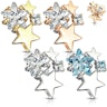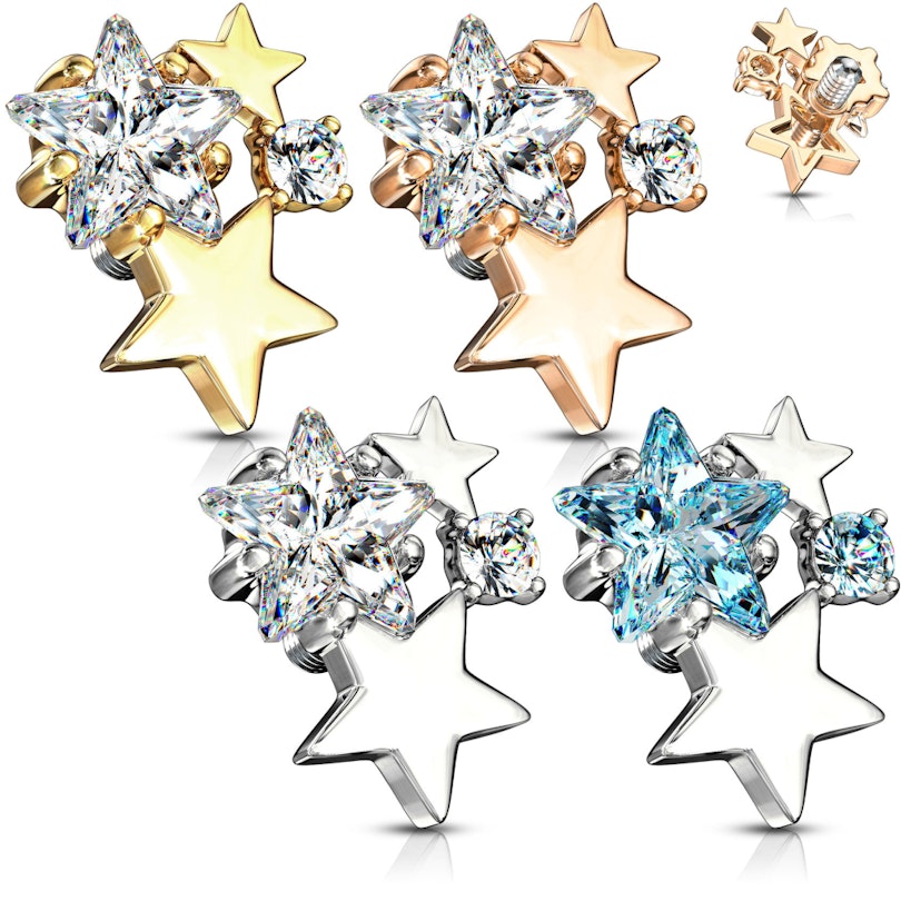 As estrelas são o seu desenho favorito quando se trata de joias para o corpo? Então temos a joia microdermal perfeita para si. Com esta peça conseguirá não só uma, mas três estrelas: duas com superfície espelhada e outra com pavimento duplo. Há muito para ver nesta joia! As estrelas são feitas de bronze e o parafuso na parte de trás (aquele que é parafusado na sua base), é feito de aço cirúrgico.