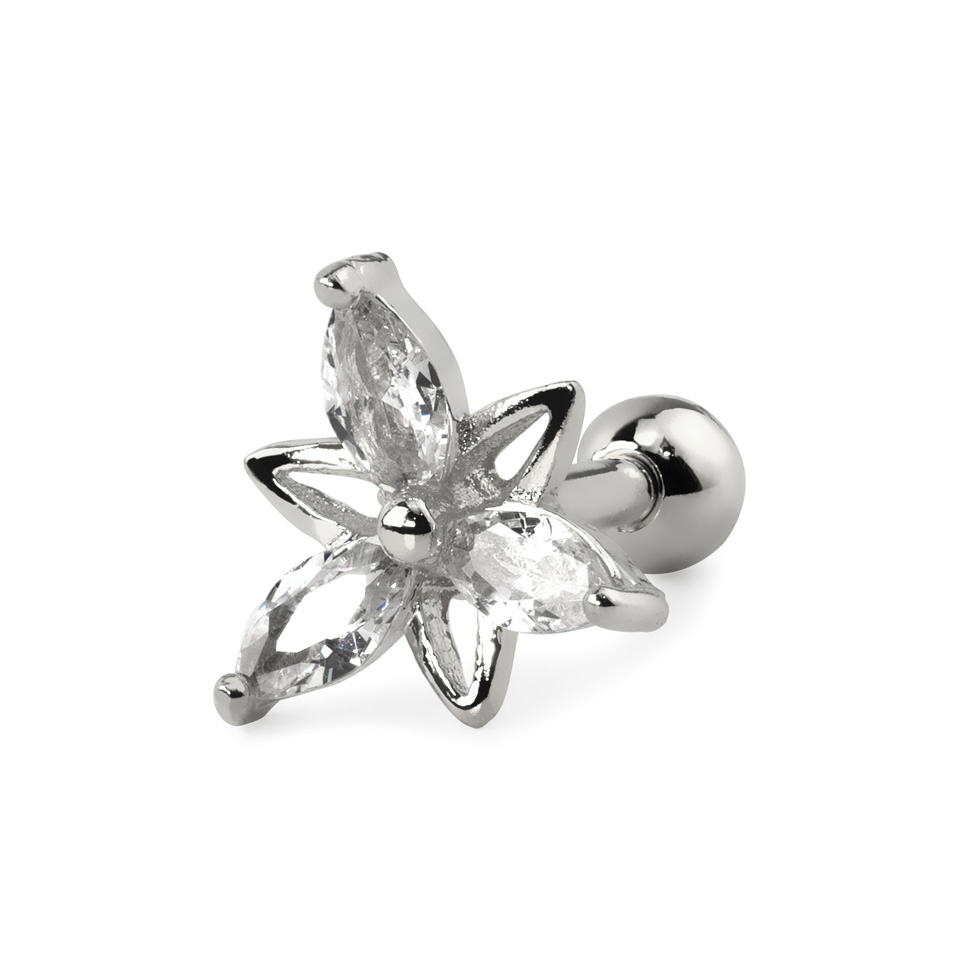 O que à primeira vista pode parecer um fidget spinner, na verdade, é uma flor com três pétalas brilhantes num barbell de aço cirúrgico. A joia é concebida para piercings na orelha como o no lóbulo, no hélix ou no trago. Também a podes utilizar noutras partes do corpo; porém, terás de te certificar de que as dimensões do piercing combinam com as do teu piercing e que assenta na tua anatomia. Por exemplo, não seria prudente utilizar esta joia num piercing no lábio por causa da bola que tem na extremidade traseira.