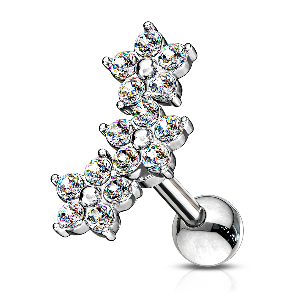 Esta joia de piercing é ideal para uso na helix, que também podes olhar para o modelo da imagem do produto acima. As três flores que estão na frente da barra dobram-se levemente para que sigam a borda da orelha. A parte frontal mede 12 mm de flor para flor e consiste em 3 pequenas flores floridas. As flores podem ser seleccionadas em três cores diferentes - é apenas a cor que é a diferença entre os três modelos. Tudo o resto é o mesmo.