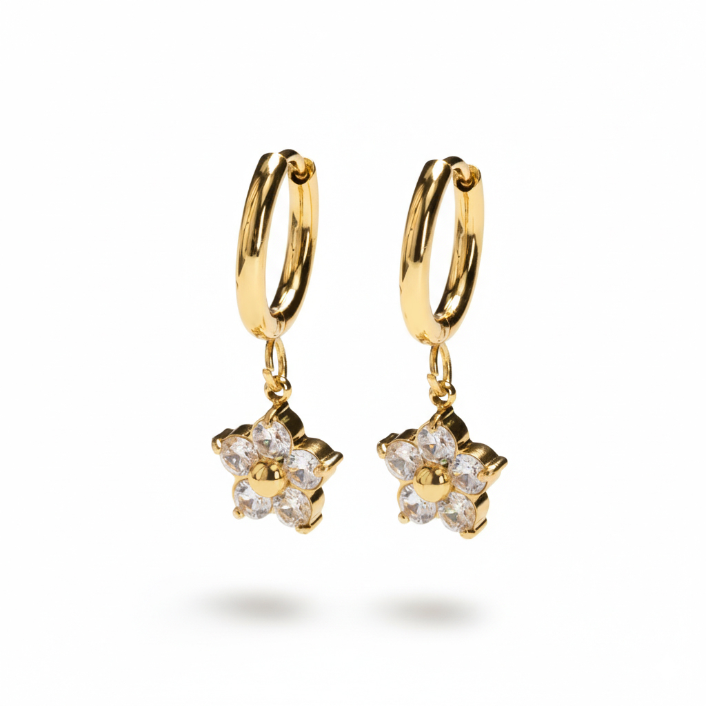Este par de argolas com flor pendente foi feito para chamar atenção. Cada argola tem uma pequena flor pendente com pedras cravadas com garras; o detalhe perfeito para captar olhares quando te mexes. Este é o tipo de argolas que vai atrair a atenção de todos. Vêm com fecho articulado, ou seja, são fáceis de pôr e muito confortáveis de usar. Disponíveis em dourado e prateado.