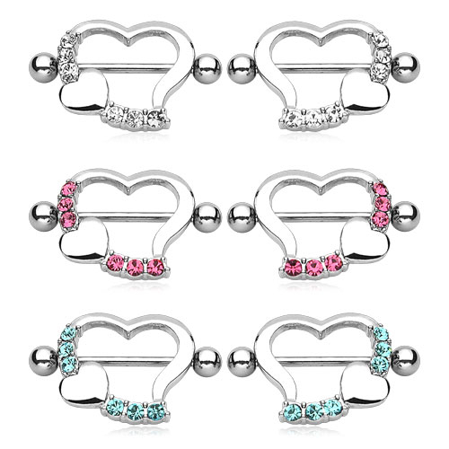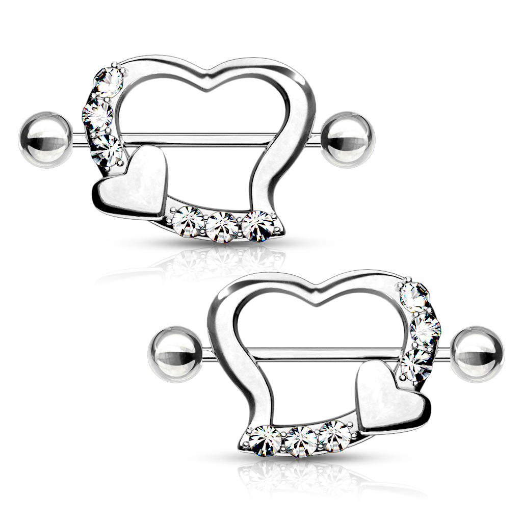 Aqui está um conjunto de dois escudos para o teu piercing no mamilo, em forma de coração, que contém um conjunto de seis pedrinhas num dos lados e um coraçãozinho mais pequeno.