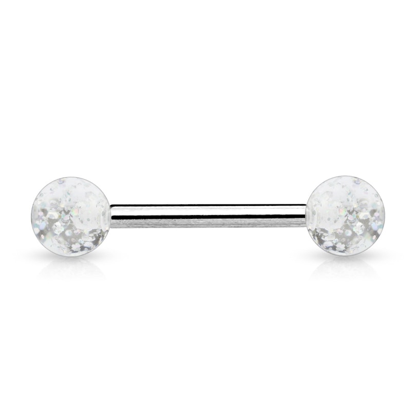 Barbell para piercing na língua em aço cirúrgico com bolas acrílicas em várias cores. O acrílico não é um material duro, como o aço, pelo que os teus dentes estarão seguros. Por isso, recomendamos que uses jóias com bolas acrílicas, já que protegem os teus dentes e gengivas.