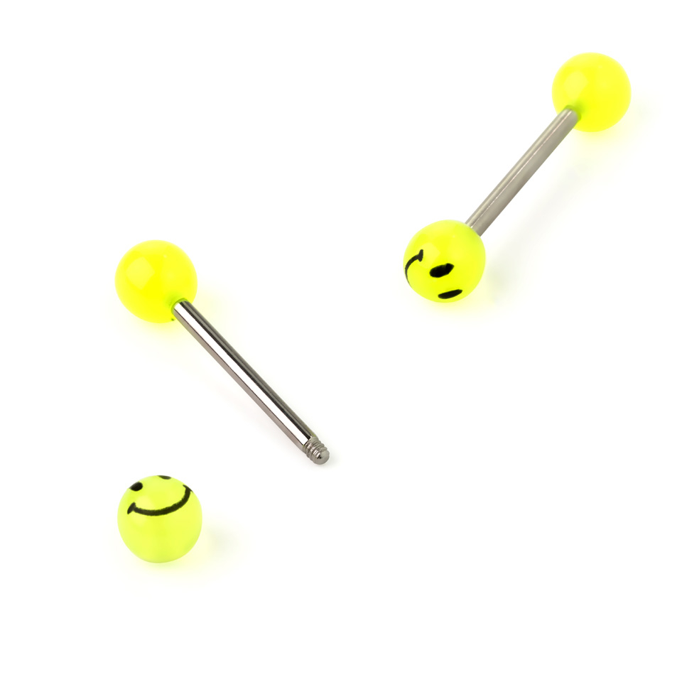 Aqui está um barbell de língua fofo e divertido que brilha no escuro e tem uma cara sorridente.