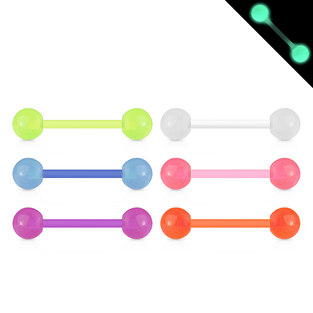 Aqui tens um fabuloso barbell para a língua que brilha no escuro. Escolhe entre seis bonitas cores. Este barbell para a língua é feito de acrílico, um material muito suave e flexível, além de ser seguro para os teus dentes e gengivas. O acrílico também tem a vantagem de não conter substâncias nocivas como o níquel.