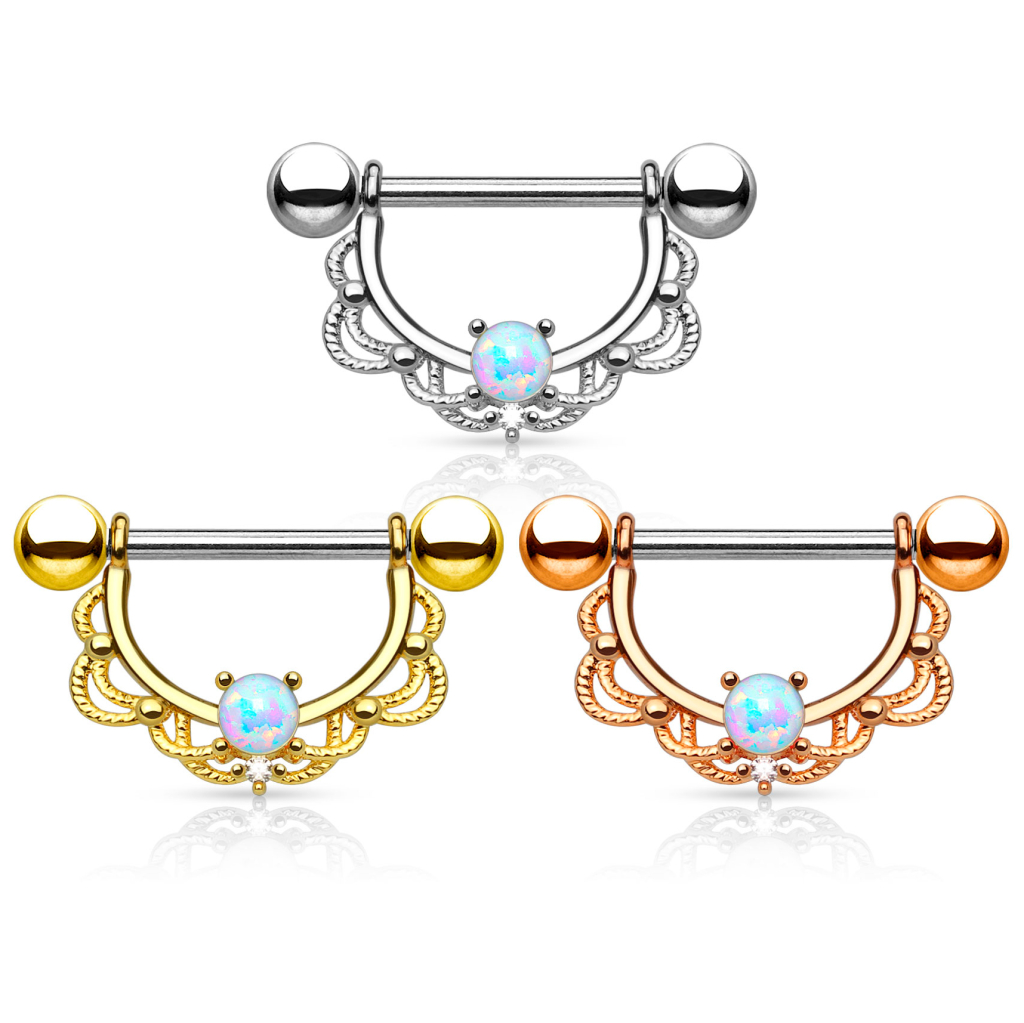 Esta é a sua oportunidade de mimar os seus mamilos com esta bonita joia, que não poupa nos bonitos detalhes. A joia está decorada com uma bonita e elegante filigrana, que fica pendurada como uma corrente e é simétrica, além de ter uma bonita opala no centro. A filigrana tem os cantos redondos, e junto com a opala redonda, libertam uma sensação de harmonia.