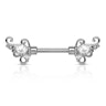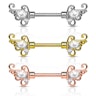 A joia que vê na foto acima é intencionada para piercings de mamilo. A parte livre da barra mede 12 mm. e em cada extremidade encontra-se lindos ornamentos com pedras no meio. O desenho parece vir da própria barra onde se divide entre vários segmentos que se enrolam no fim.