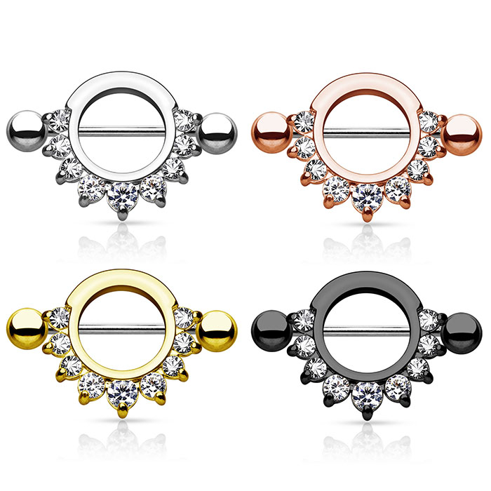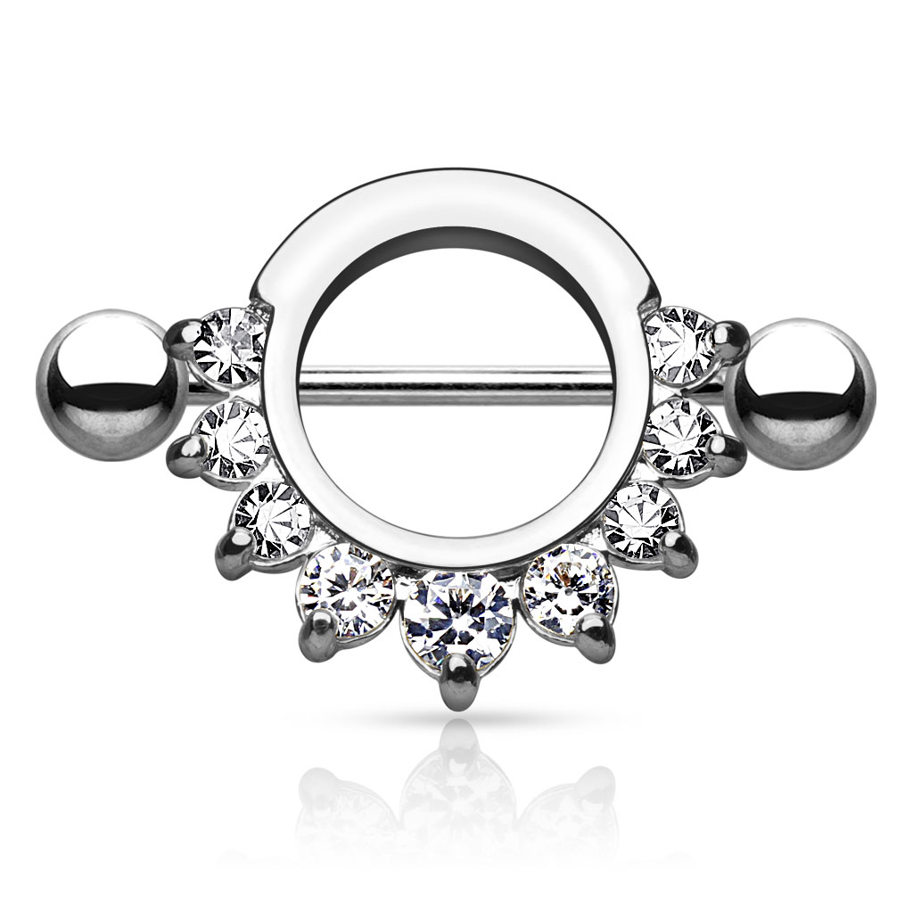 Chegou o momento de dar um pequeno capricho ao seu piercing do mamilo, com esta belissima joia. Este escudo pra o mamilo contém uma barra que atravessa esta argola na parte posterior. Na parte frontal da argola encontra-se 9 bonitos brilhantes que compõem uma meia-lua na parte inferior.
