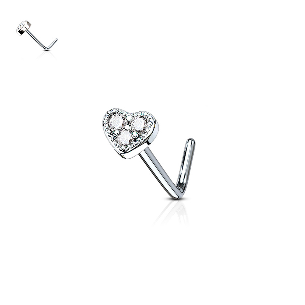 Este piercing de nariz é uma mistura de uma tacha de nariz com uma barra de nariz. A joia não tem uma tacha na extremidade como nas tachas de nariz comum, mas por outro lado tem mais do que uma barra de nariz tem. Barras de nariz normalmente são simplesmente uma barra recta. Mas este piercing de nariz tem uma dobra de 90 graus na extremidade, que fica na parte interior do nariz para que a joia não caia.
