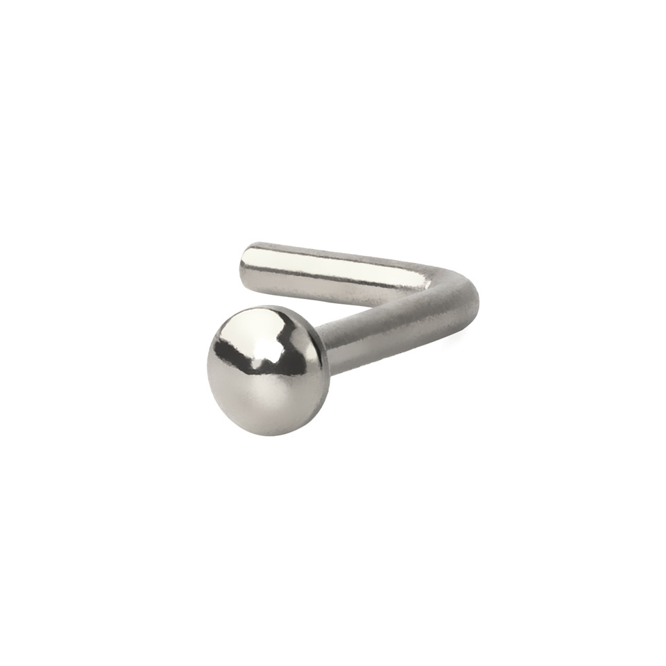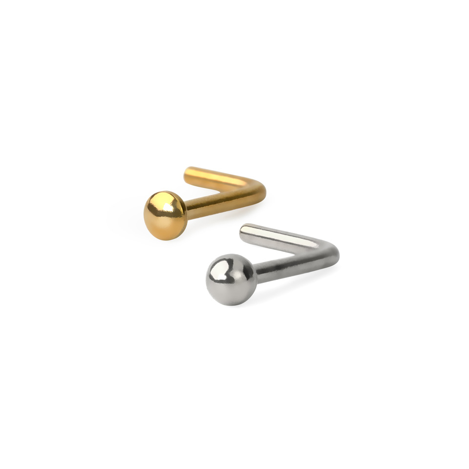 Este piercing de nariz tem uma pequena curva no meio da barra que faz com que a joia fique bem presa no seu lugar quase como uma tacha de nariz. Ambos os modelos ficam presos no seu piercing e é mais seguro que uma simples barra de nariz que simplesmente entra "reto" no seu piercing.