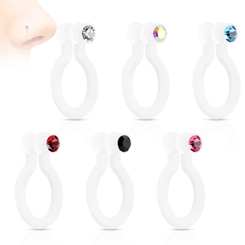 Agora pode ter um lindo piercing de nariz falso com uma única e discreta pedra, sem ter um furo no nariz. Esta linda joia aparenta ser um pequeno anel transparente de PTFE, que é um material de plástico claro e macio, com uma pedra bem onde um piercing entraria no nariz. Mas na verdade, é apenas um suporte que fixa-se ao redor do nariz onde esse pressiona o nariz para manter-se em posição.