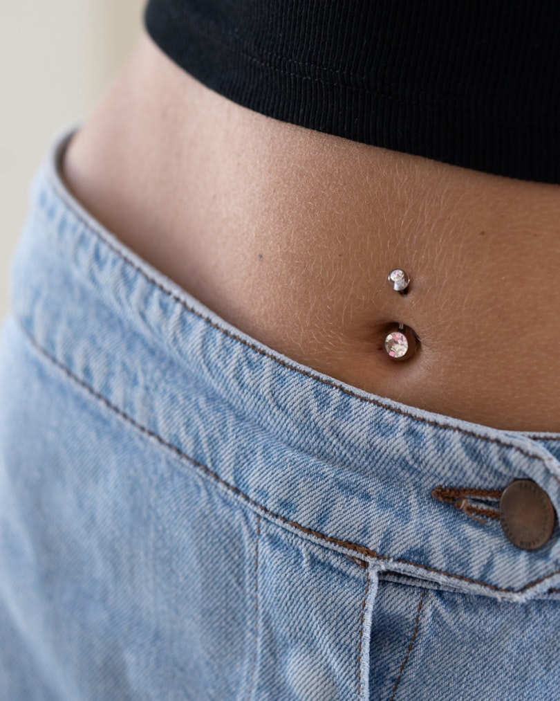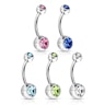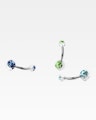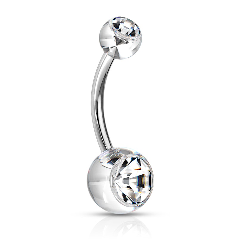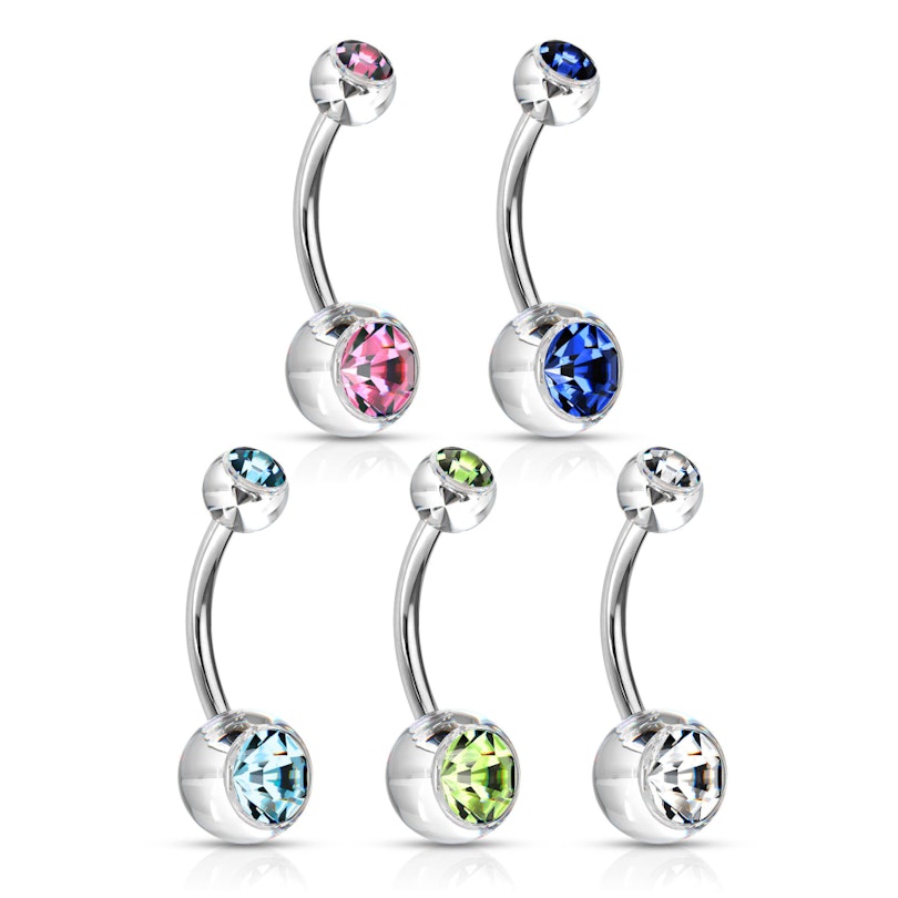 Esta é uma simples mas bonita barra curvada de umbigo para uso diário a preço competitivo. A barra é feito de aço cirúrgico, o topo e bola inferior são acrílicos. Ambas têm uma pedra estilo bisel que podes escolhe de entre cinco cores. Se escolher a branca obterás um look clássico. Se preferires algo mais atrevido, adquire uma que contraste com a tua pele.