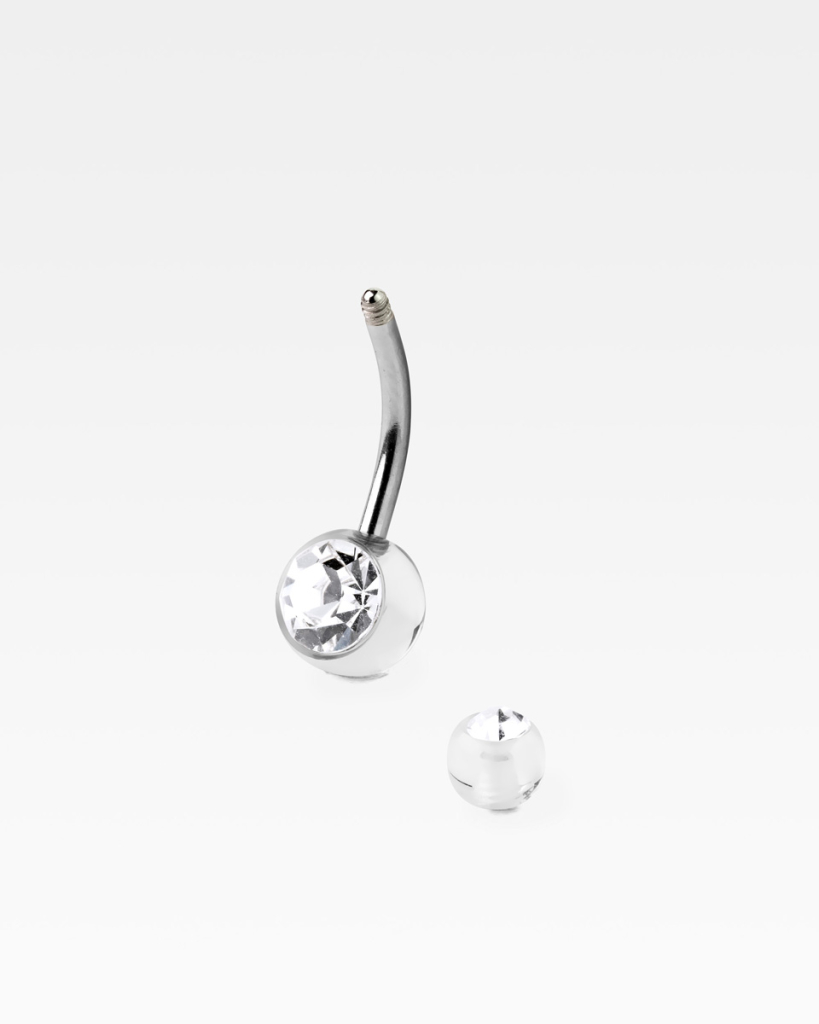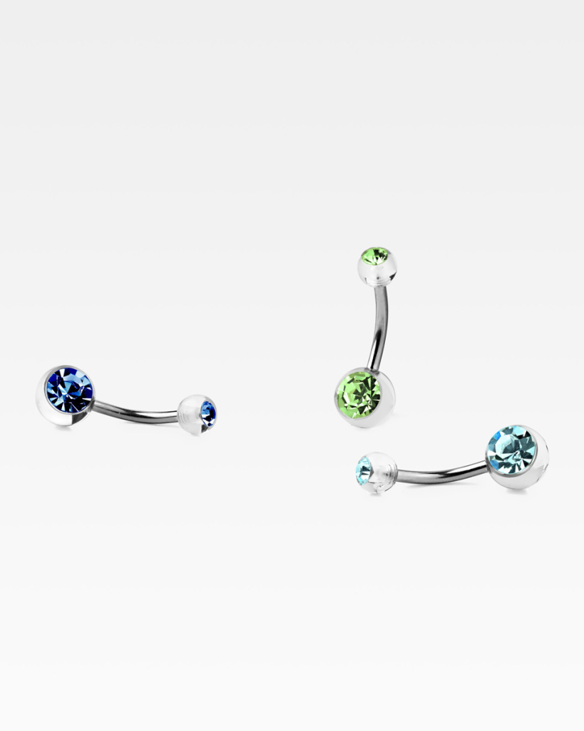Esta é uma simples mas bonita barra curvada de umbigo para uso diário a preço competitivo. A barra é feito de aço cirúrgico, o topo e bola inferior são acrílicos. Ambas têm uma pedra estilo bisel que podes escolhe de entre cinco cores. Se escolher a branca obterás um look clássico. Se preferires algo mais atrevido, adquire uma que contraste com a tua pele.