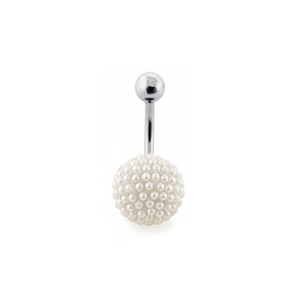 Piercings de umbigo e bolas de pérolas são coisas que combinam muito bem uma com a outra. Este modelo não é excepção com as suas várias pérolas que enfeitam a bola inferior. A barra da joia e a bola superior são feitas de aço cirúrgico e a bola inferior é feita de uma massa de argila colorida onde pequenas bolas de acrílico foram aplicadas. Naturalmente a cor da bola de argila é compatível com a cor das bolinhas de acrílico.