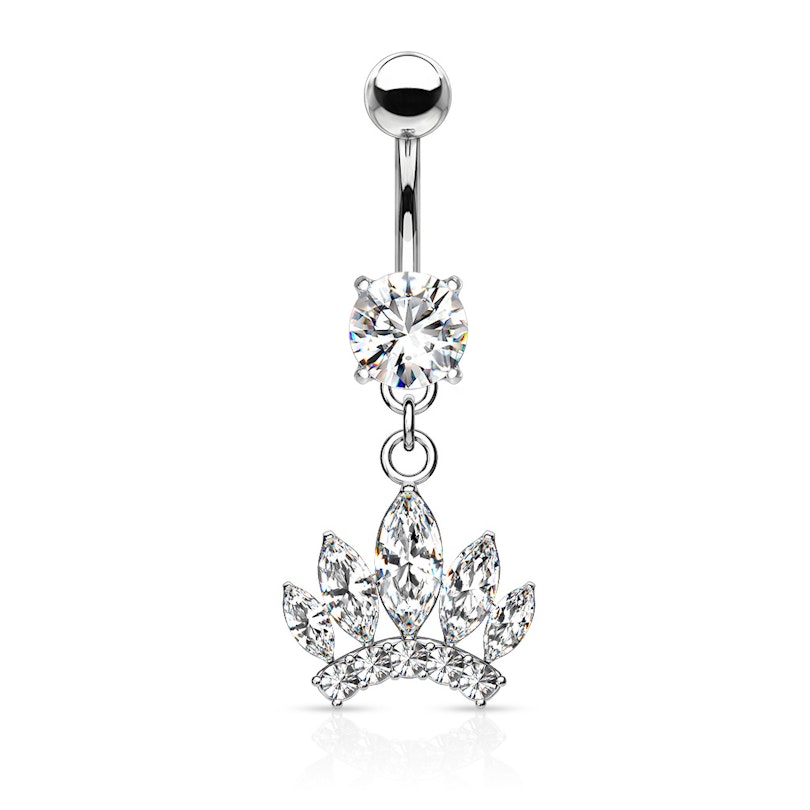 Converta-se numa princesa por um dia ou por todo o tempo que quiser, com esta joia super doce para o piercing do umbigo, que tem uma coroa com brilhantes no seu pendente. Esta coroa feminista é feita de brilhantes: a parte superior da coroa é formada por cinco brilhantes compridos, sendo o do centro o mais largo e os das extremidades mais curtos. Além destes 5 brilhantes, encontrará também uma pequena fita de brilhantes redondos na parte inferior da coroa.