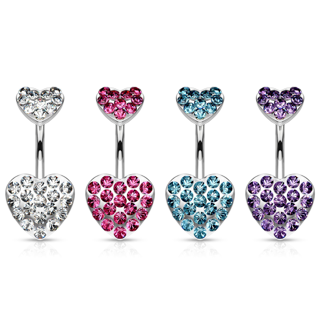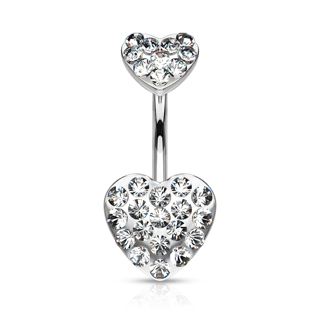 Umbigo piercing com dois corações de pedrinhas