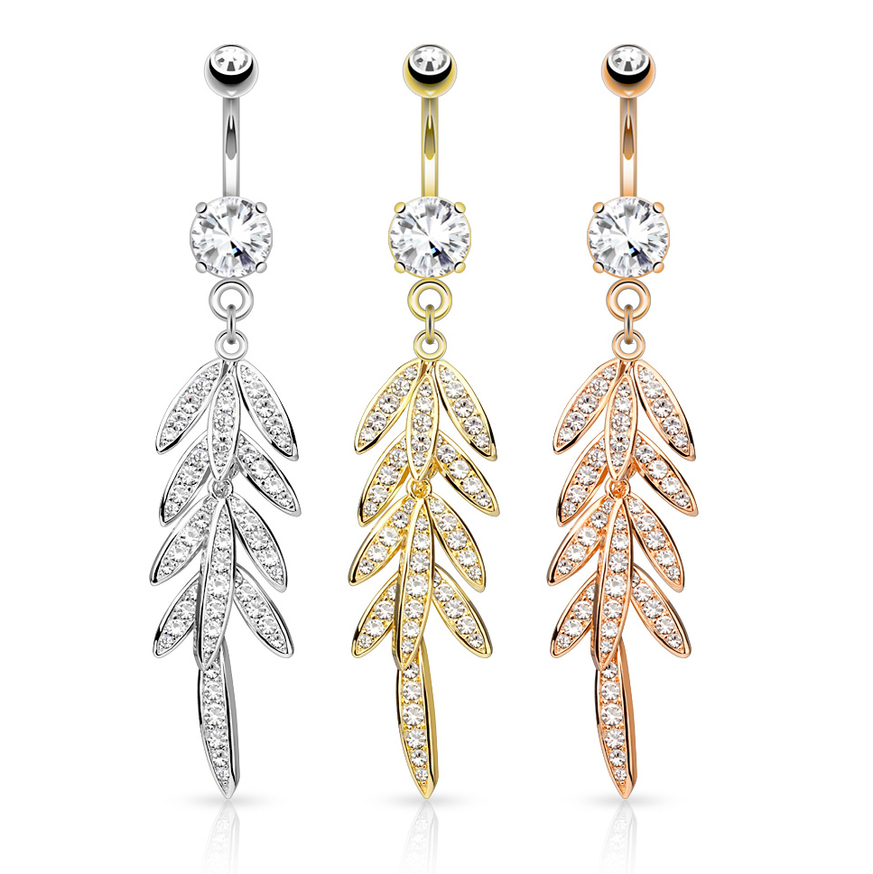 Linda e elegante joia para o seu umbigo, onde no pendente se encontram várias pequenas folhas que se movimentam livremente. Todas as folhas são decoradas com pequenas pedras claras. No total há mais de 50 pequenas pedras, que brilham quando a joia se movimenta e as folhas balançam de um lado para outro.