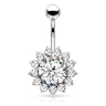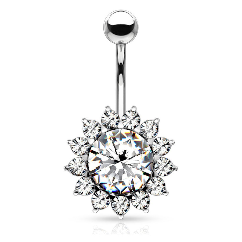 Este piercing para o umbigo tem um bonito brilhante no centro, muito grande em comparação com outras joias similares. Quando a luz incide diretamente, faz com que a joia seja especialmente bonita. Ao redor deste tem outros brilhantes menores que representam as folhas ao redor do girassol.