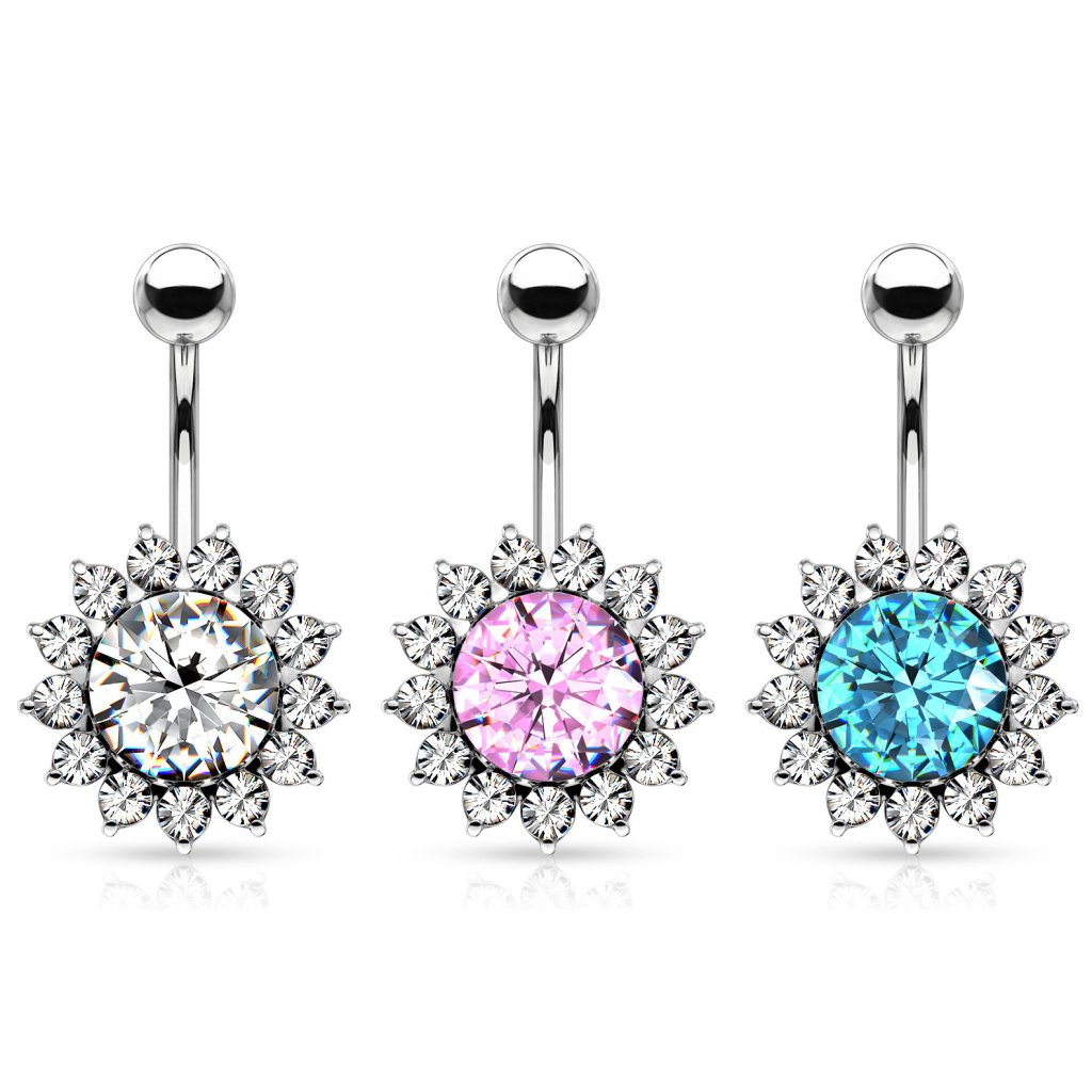 Umbigo piercing com girassol e brilhantes
