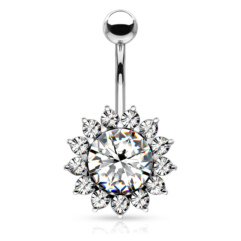Este piercing para o umbigo tem um bonito brilhante no centro, muito grande em comparação com outras joias similares. Quando a luz incide diretamente, faz com que a joia seja especialmente bonita. Ao redor deste tem outros brilhantes menores que representam as folhas ao redor do girassol.