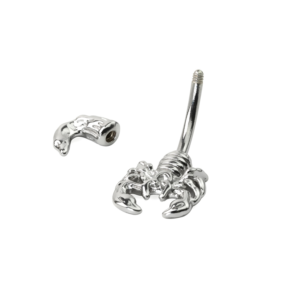 Esta joia para o umbigo não contém qualquer pendente nem outra parte solta, pelo que a poderá levar o dia todo. O seu bonito escorpião é muito detalhado e consiste em duas partes que se juntam formando este precioso animal. O corpo do escorpião está colocado onde normalmente seria a bola inferior: a cabeça, pinças, abdómen e patas, enquanto a sua cauda fica por cima do umbigo, onde estaria a bola superior, e, além disso, está em posição de ataque. Como vê, trata-se de um escorpião muito parecido aos de verdade, e quanto as duas partes das joias estão colocadas na sua perfuração, poderá ver o animal por completo.