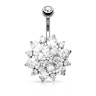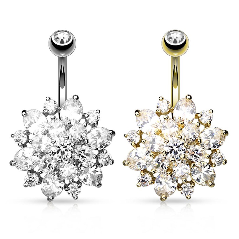 Quer colocar no seu umbigo uma excelente joia, além de ser muito feminina? Agora tem a oportunidade de fazê-lo com estilo, com esta maravilhosa e única joia para o umbigo com flor grande de muitos brilhantes.