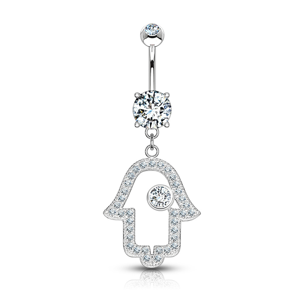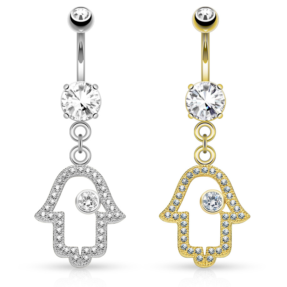 Umbigo piercing de ouro 14 quilates com mão hamsá decorada com brilhantes