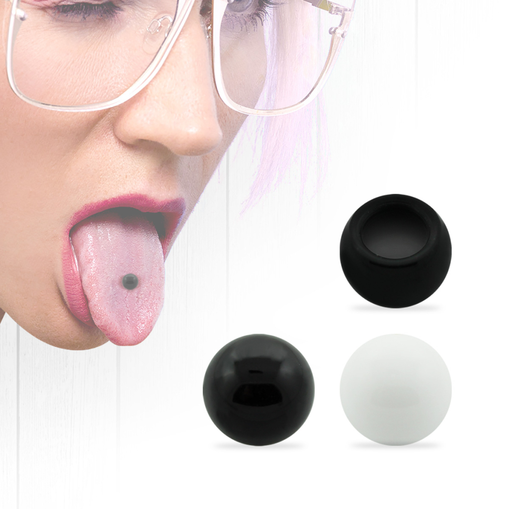 Apresentamos-lhe um piercing falso para a sua língua, que surpreendentemente não tem que ter uma perfuração na língua para a puder colocar. Com esta joia pode ver, e de certa forma sentir, como seria ter um piercing na língua. Está disponível em duas cores distintas: branco e preto. A sua bola é feita em acrílico, apesar de que não se trata bem de uma bola, mas sim uma meia bola com um buraco por dentro. Esse buraco permite criar vácuo, de forma a que a joia fique presa à língua e dar a impressão de se tratar de um piercing verdadeiro.