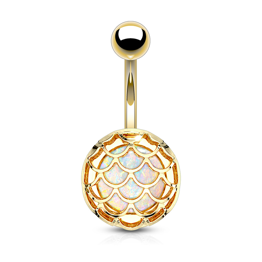 Umbigo piercing com pedra opala embutida num desenho de escamas