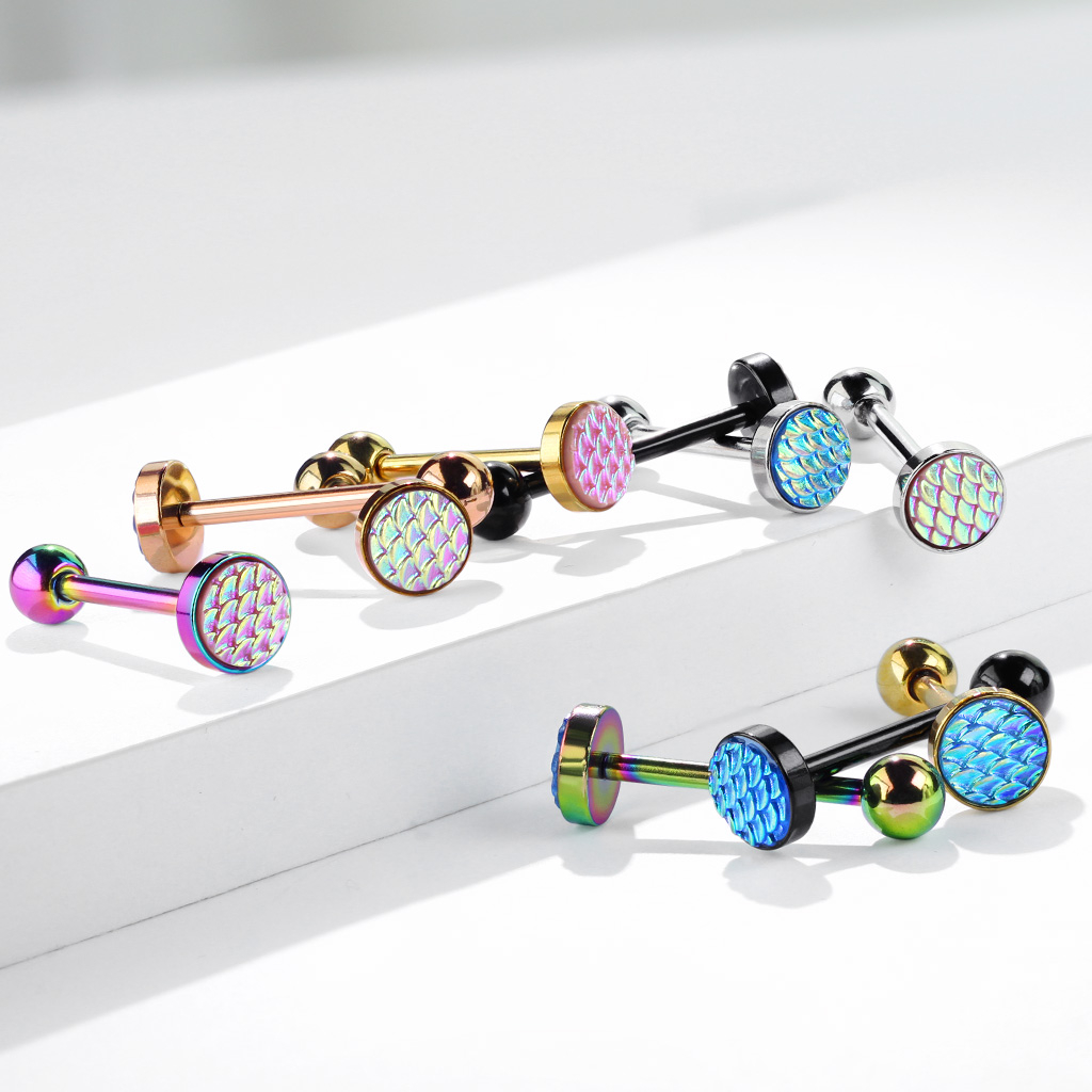 Nesta fotografia de produto, pode ver um piercing para a língua do mais original possível. Esta joia tem uma bola superior com um desenho de escamas "tornasolado", o que quer dizer que mudar de cor. As camas são feitas de uma resina que permite que os tons das cores mudem em função da luz. Se, por exemplo, escolher o modelo com escamas rosa, verá distintos tons da cor rosa na sua joia quando a luz se incidir. Além disso, pode também escolher a cor da barra da sua nova joia - todas as combinações levam um toque muito original e refrescante.