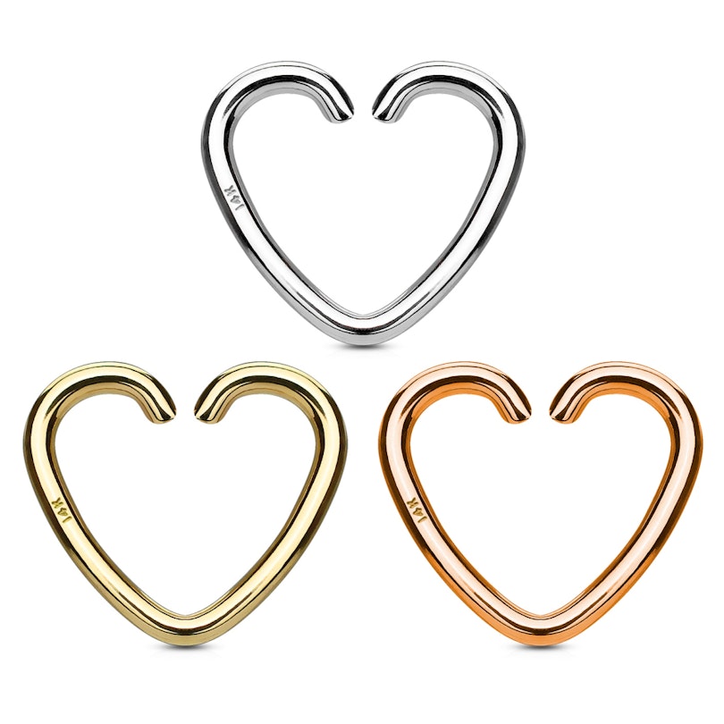 Pode comprar este coração em diferentes versões, entre as quais pode escolher o tipo de ouro, assim como a grossura que melhor se ajuste ao seu piercing. As medidas internas deste coração são de 10 mm de largura por 9 mm de altura. Todos os modelos são do mesmo tamanho, excepto na grossura da barra. Poderá colocar esta joia na maioria dos piercings de orelha, mas provavelmente o trago, hélice e daith serão os melhores piercings.