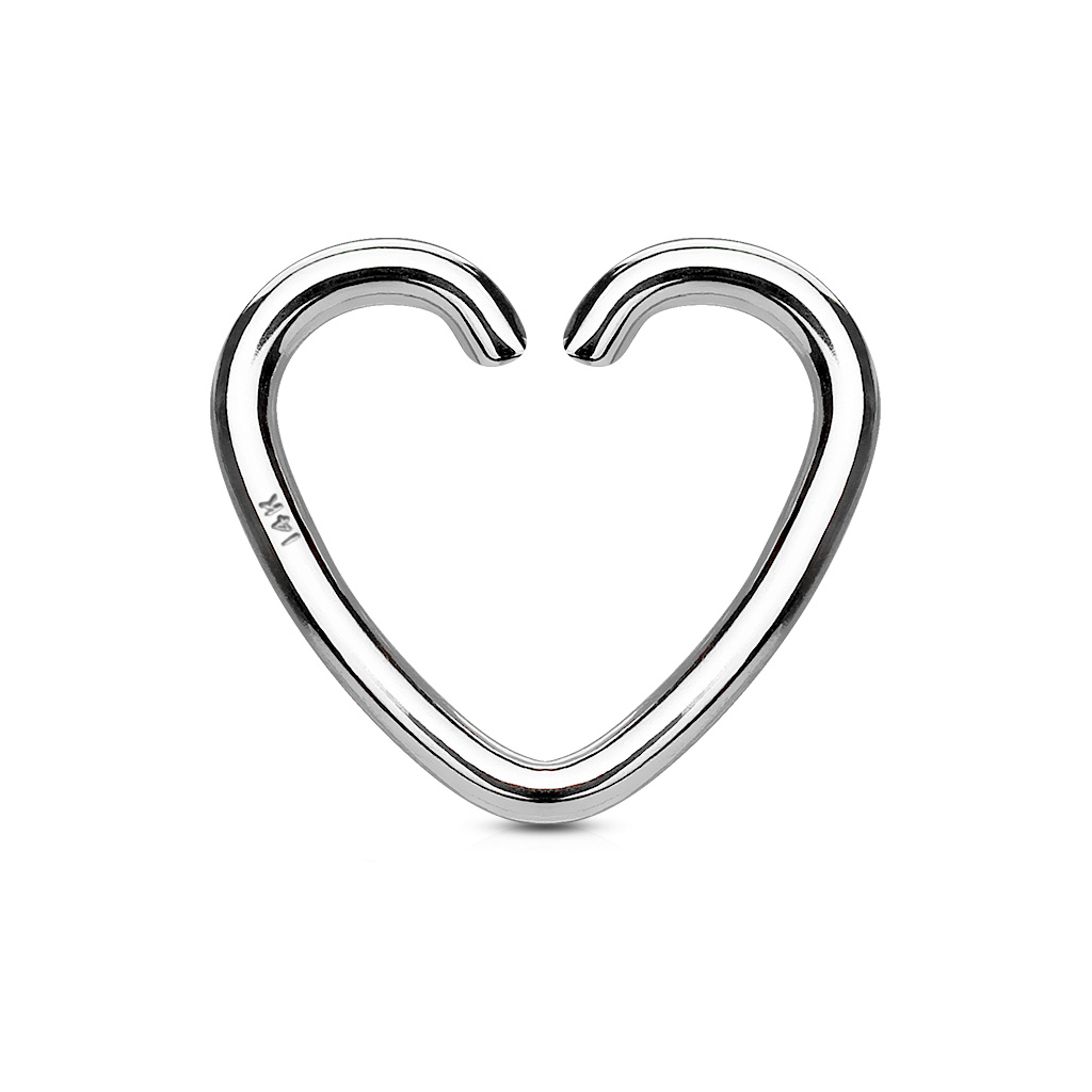 Pode comprar este coração em diferentes versões, entre as quais pode escolher o tipo de ouro, assim como a grossura que melhor se ajuste ao seu piercing. As medidas internas deste coração são de 10 mm de largura por 9 mm de altura. Todos os modelos são do mesmo tamanho, excepto na grossura da barra. Poderá colocar esta joia na maioria dos piercings de orelha, mas provavelmente o trago, hélice e daith serão os melhores piercings.
