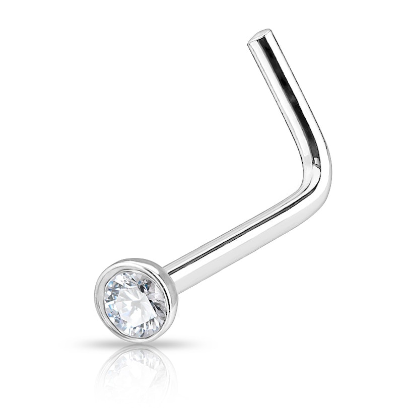 Este piercing encontra-se num ponto médio entre o parafuso e uma barra para o nariz, mas a verdade é que fica excelentemente preso graças ao seu ângulo recto a 6 mm da extremidade da barra. Esta está disponível em duas grossuras distintas, para que possa escolher a que melhor se ajuste à sua perfuração.