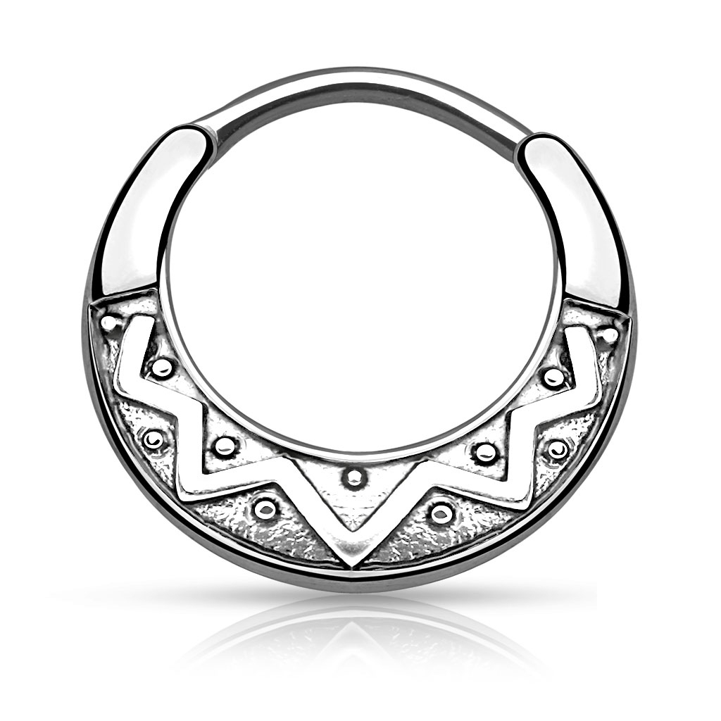 Se gosta de joias únicas que se destacam das outras, esta joia para o piercing do septo de certo encantará. Tem fecho de clique, o que significa que a barra que passa pela perfuração se une à joia com uma dobradiça numa das extremidades, enquanto que o outro é onde deve encaixar a joia com um clique, de modo que é muito, muito fácil de colocar.