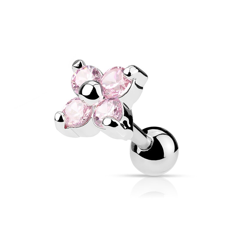 Este piercing de orelha é feito de aço cirúrgico com um desenho em forma de flor, e está disponível em três cores distintas. Em cada flor existe um brilhante em forma de diamante.