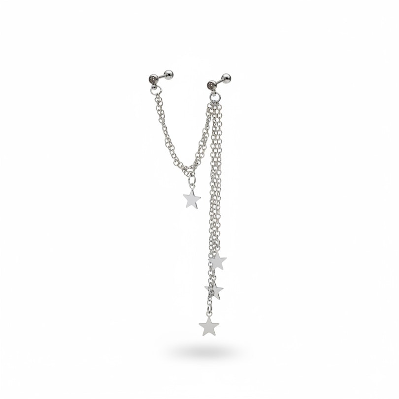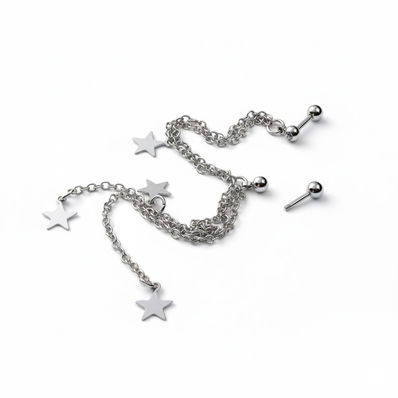 A joia consiste em duas pequenas barras de 6 mm que têm um pequeno brilhante branco, sendo as bolas frontais de 4 mm. Ambas as barras estão unidas por correntes que decoram a sua orelha de uma forma espectacular.